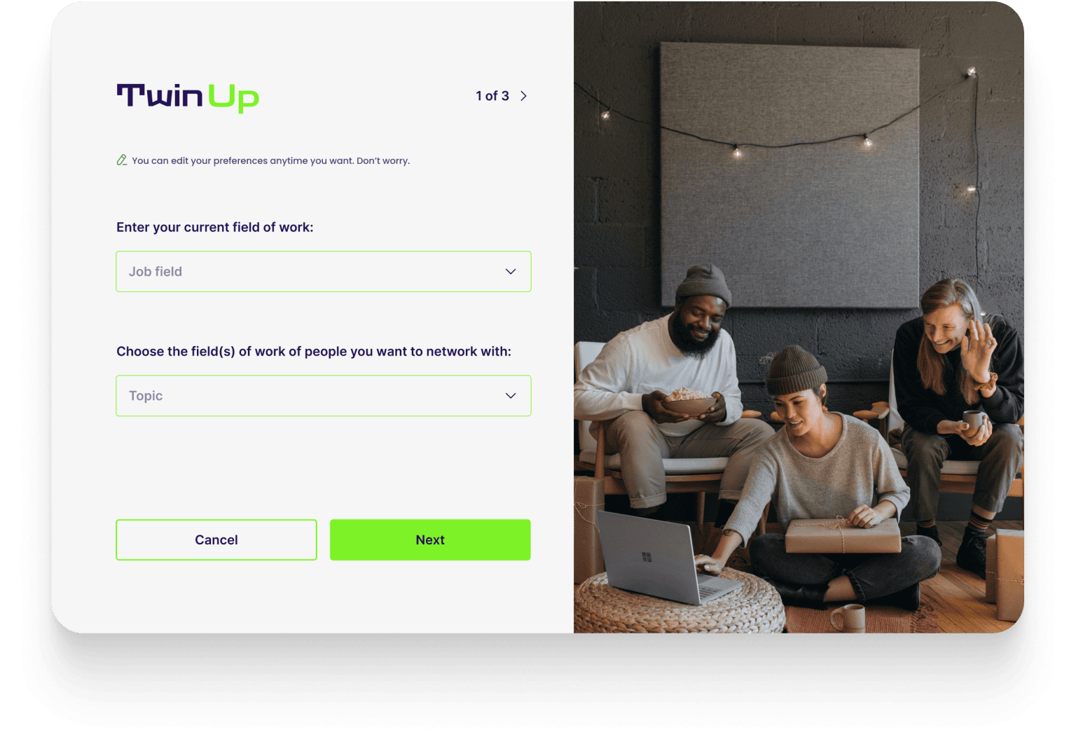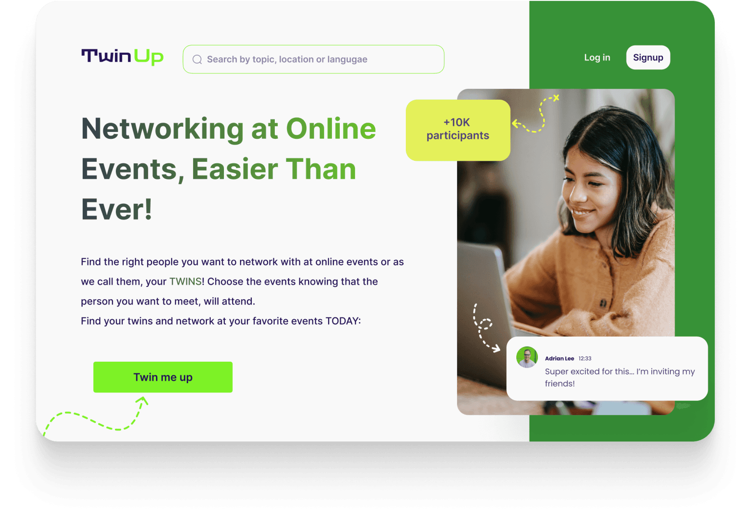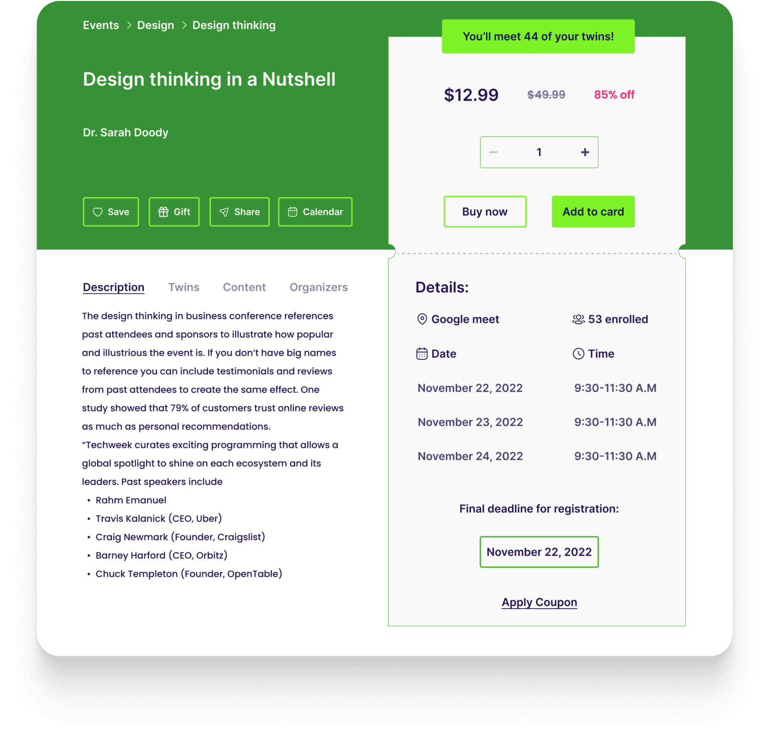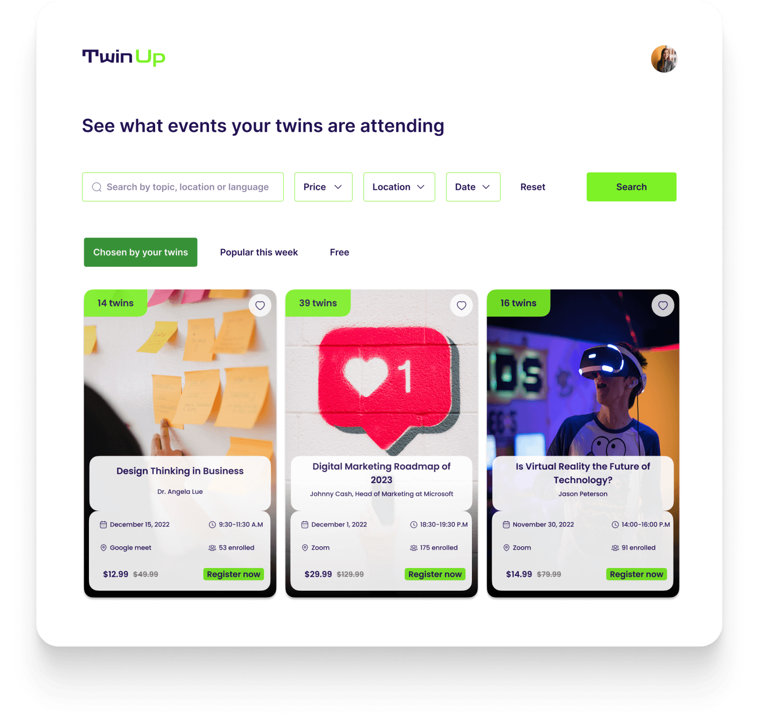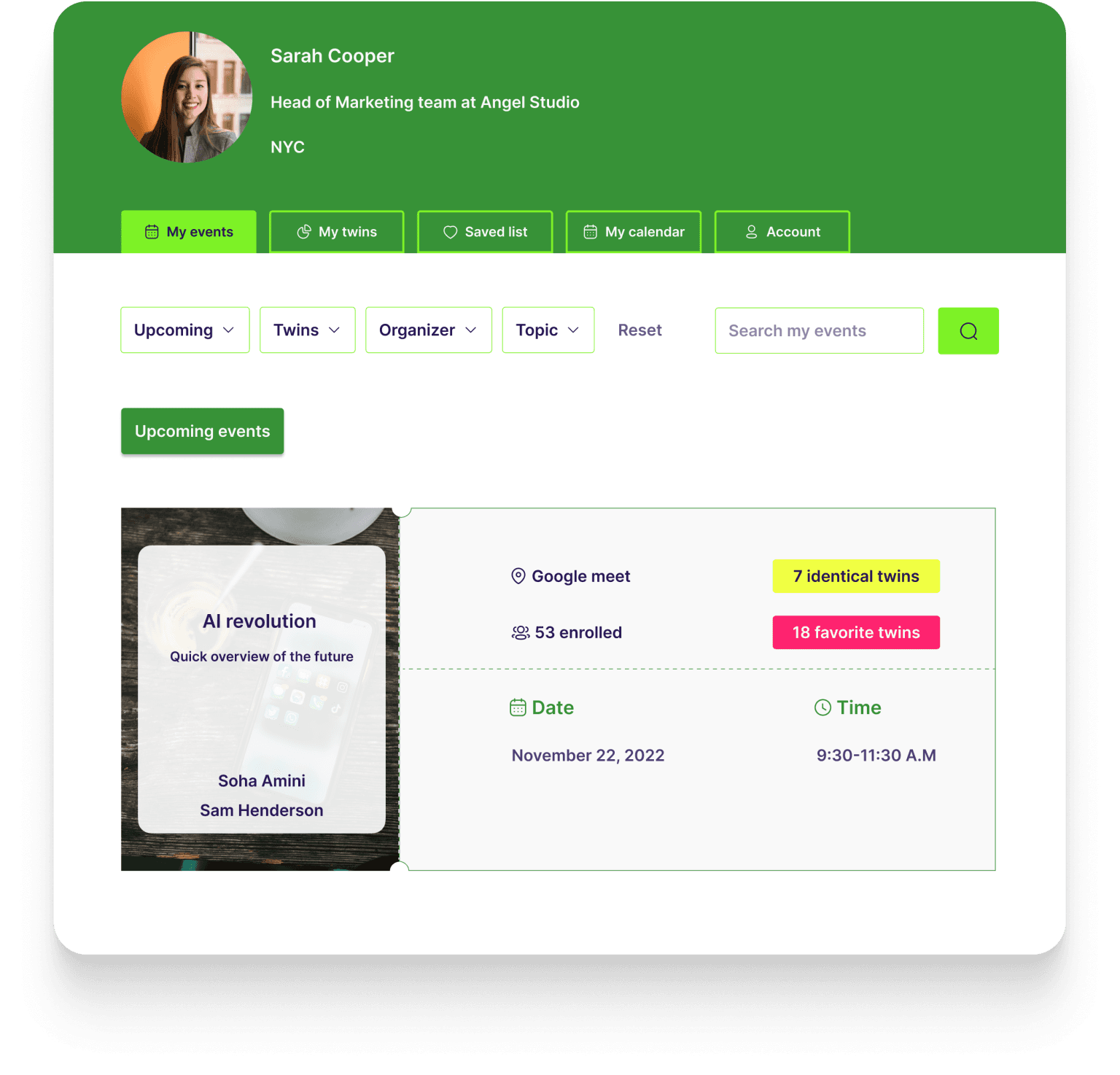 Based on the results of the TwinUp process, users can choose the events based on main factors that is shown on the event card: